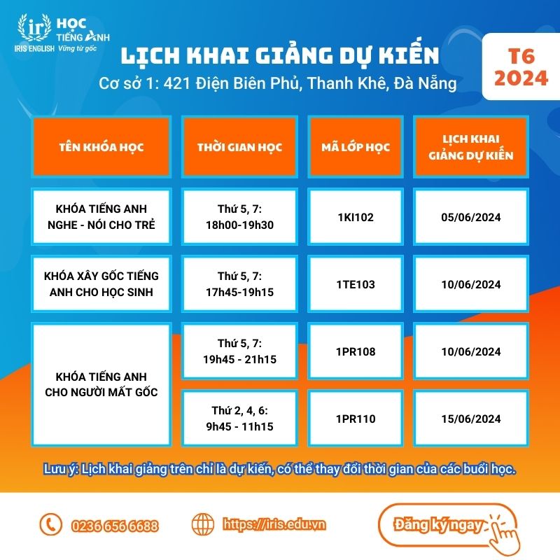 Chào mừng tháng 6 với tiếng ve kêu rộn ràng và sắc phượng đỏ thắm, IRIS mở cửa đón chào học viên đăng ký các khóa học Tiếng Anh mới. Chúng tôi tự hào cung cấp các khóa học đa dạng, phù hợp với mọi lứa tuổi từ trẻ em đến người lớn, từ ngày 1/6/2024 đến 30/6/2024.